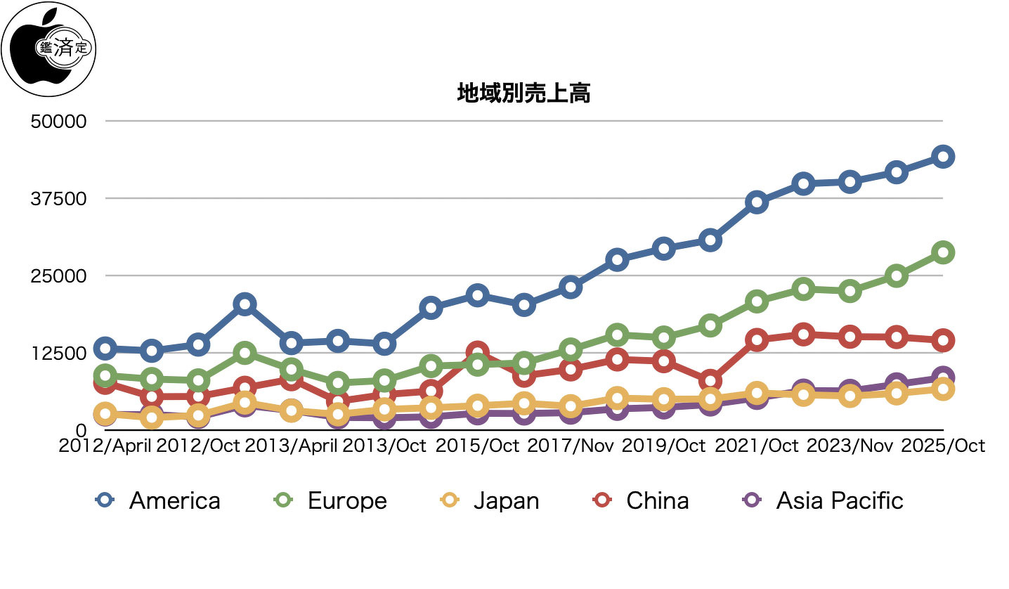 Appleが、2025年度第4四半期の決算報告を発表しています。当四半期の売上高は1,025億ドル、純利益は274億ドル、希薄化後の1株当り利益は1.85ドル。前年同期の業績は、売上高が949億ドル、純利益は147億ドル、希薄化後の1株当り利益は0.97ドルでした。当四半期の米国市場以外の売上比率は57%だったと報告しています。