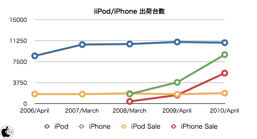 iPod/iPhoneの場合、iPodは昨年同期よりも2%減少、iPhoneは昨年同期よりも230%増加していることが見てとれます。