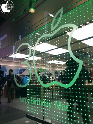 Apple Store, Ginzaでは、1階の正面ウィンドウに、すりガラス風カッティングシートを使用して、3 Happy Birthday, Macと書かれ、その後ろでLEDが光るディスプレイが設置されていました。
