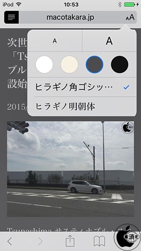 iOS 9のSafariリーダー機能で、これまでフォントサイズのみ変更可能でしたが、iOS 9のリーダー機能では、背景色の変更と表示フォントとして、日本語本文の場合「ヒラギノ角ゴシック」「ヒラギノ明朝体」が選択可能になっています。