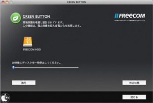 GREEN BUTTONは、Mobile Drive Mg U3 slimline用の省電力ユーティリティで、設定した時間内にドライブアクセスが無い場合、ドライブを一時停止させ、バスパワー駆動時の電力を抑えることが出来ます。