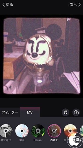 MVを選択すると、デフォルトで用意されている10種類のテーマの中から、すきなテーマを選んで、曲と動画エフェクトを自動的に処理してくれます。