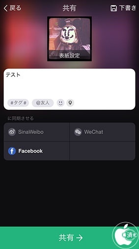 ローカル保存に加えて、Weibo、FaceBook、WeChatに投稿することが出来ます。