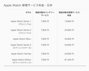 Appleが、サポート情報「Apple Watch の修理サービス料金」を公開し、液体侵入が原因で故障したApple Watch Series 2などを交換修理(本体交換)する場合の金額を公開しています。