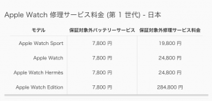 Apple Watch 修理サービス料金 (第 1 世代)の保証対象外バッテリーサービスも一律7,800円に値下げされています。
