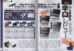 テストするモノ批評誌「MONOQLO 2012年2月号」の巻頭特集、冬の新製品辛口レビュー「ウルトラブックPC」で、MacBook Air (13-inch, Mid 2011)ZENBOOK UX31Aspire S3dynabook R631の4機種の実機比較検証テスト結果が掲載されています。