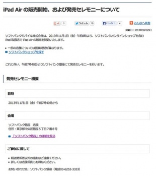 2013年10月30日(水) iPad#ソフトバンクモバイル#iPad_Air ソフトバンクモバイル「iPad Air」を11月1日より販売開始 ※本サイトは、アフィリエイト広告および広告による収益を得て運営しています。購入により売上の一部が本サイトに還元されることがあります。 ソフトバンクモバイルが、新型iPad「iPad Air」を11月1日午前8時より販売開始すると発表しています。 なお、11月1日午前7時40分よりソフトバンク銀座にて発売セレモニーを行うそうです。