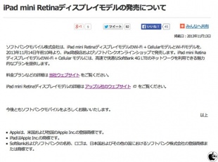 ソフトバンクモバイル「iPad mini Retina」を11月14日より販売開始