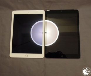 iPad Air 2とiPad Airを並べて、上から照明の明かりを反射させた状態で比べてみました。