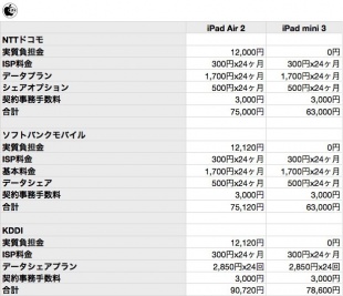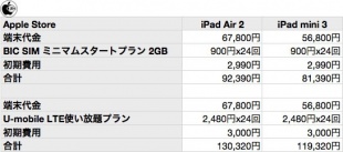 Apple StoreのiPad Air 2・iPad mini 3のSIMフリーモデルと、各キャリアモデルとの2年間総支払額比較