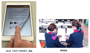 iPad向けに開発されたJALグループ共通のドキュメント配信・管理システム「LEAF CABINET」は、業務マニュアルや教育情報、社員向けメッセージ動画などを一元管理し、乗務員のスピーディーな情報伝達とスムーズな業務を実現しています。