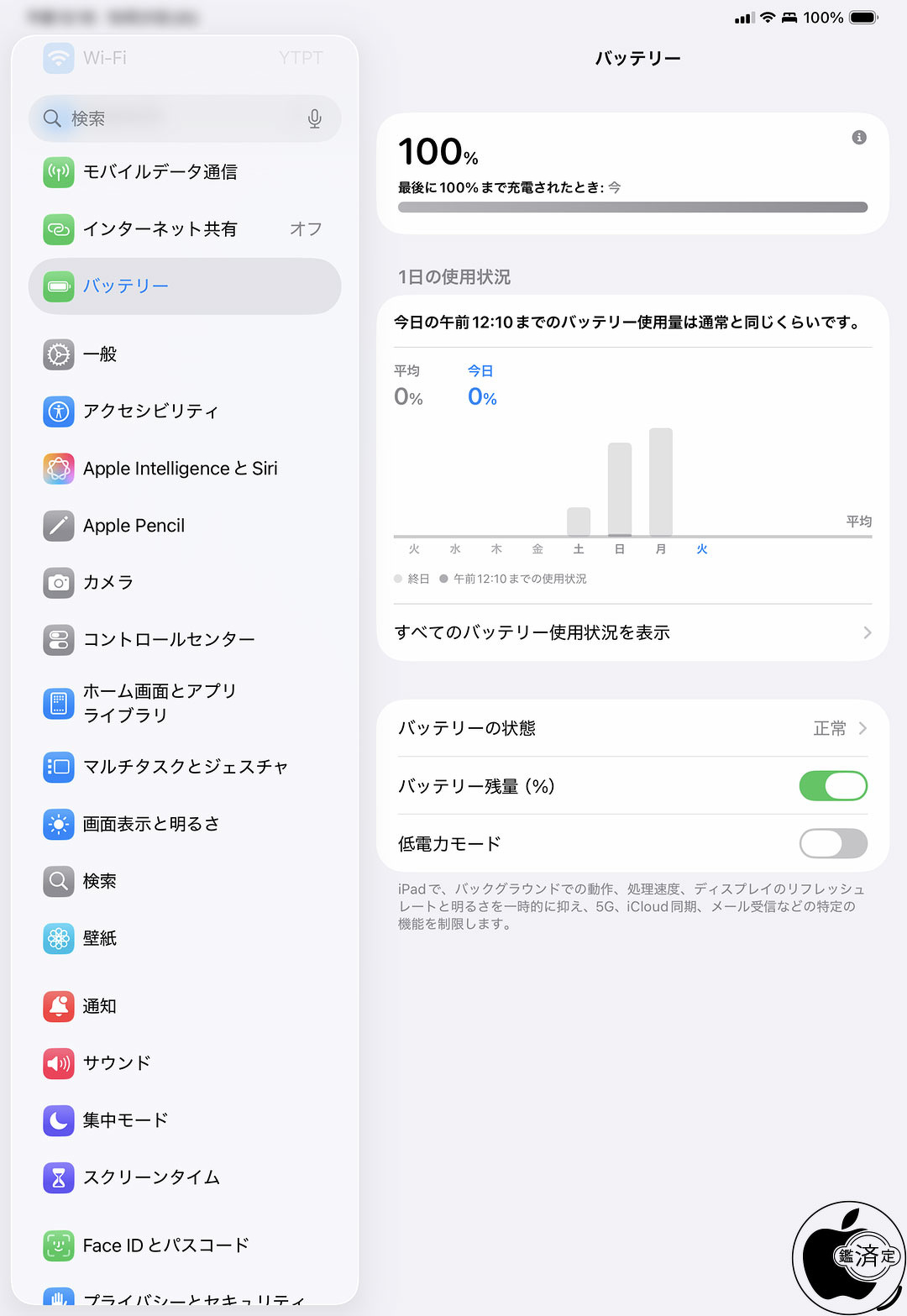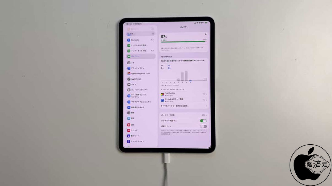iPad Pro 11-inch (M5)の設定>バッテリーは、iPad Pro 11-inch (M4)と同様に、他のiPadモデルでは表示される「明るさの自動調節」項目が非表示となります。