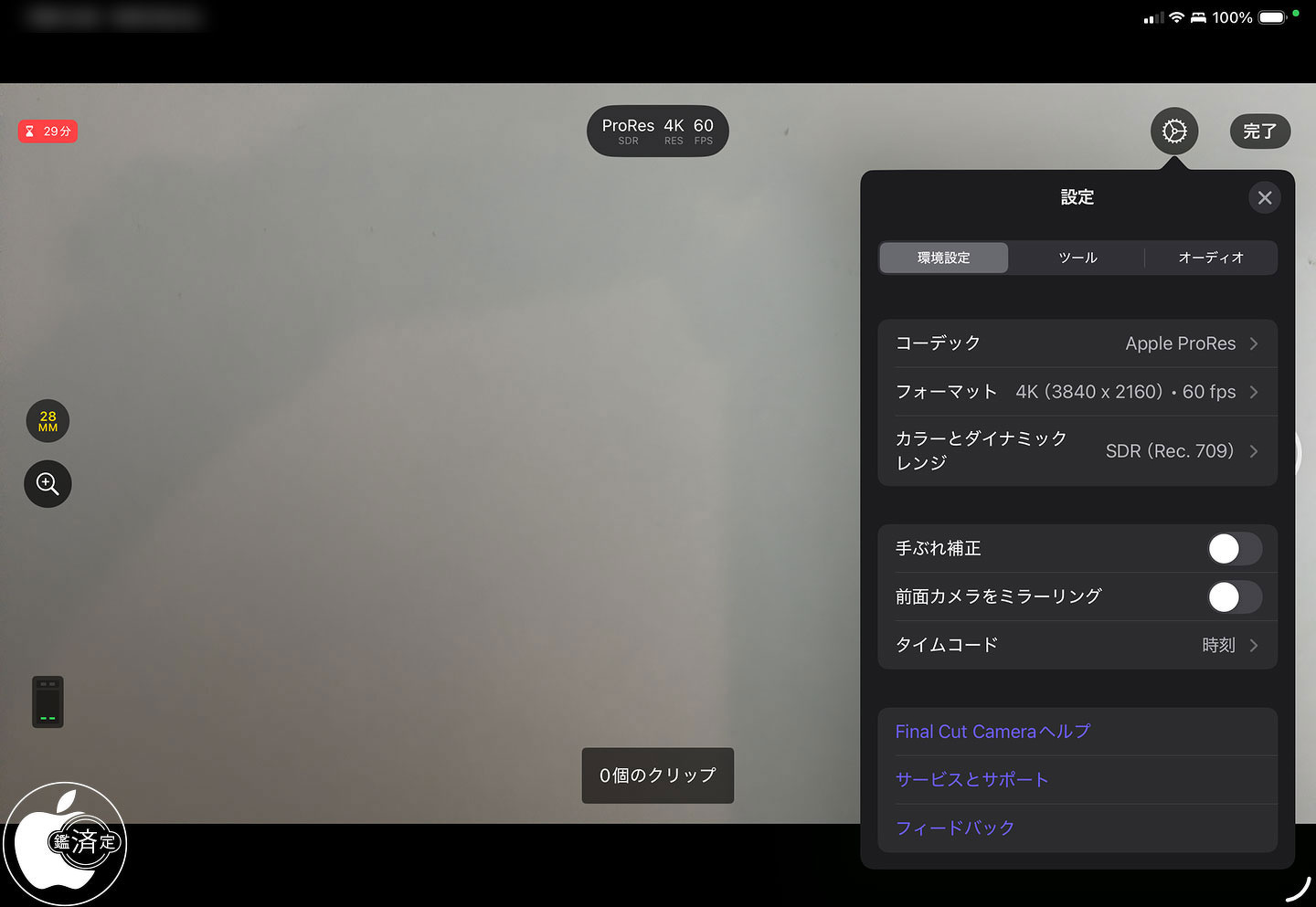 Final Cut Pro for iPadのツールバーの「カメラ」ボタンをタップし、カメラ画面の左下隅にある 「設定」ボタンをタップし、「環境設定」を表示させてみました。