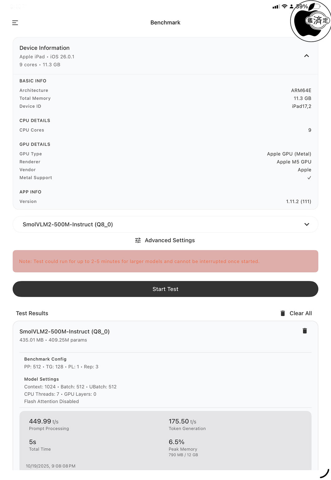iPhone/iPad用AI Chatアプリ「PocketPal AI」を利用し、超軽量VLM「SmolVLM2-500M-Instruct (Q8_0)」をダウンロードしてベンチマークを計測してみました。