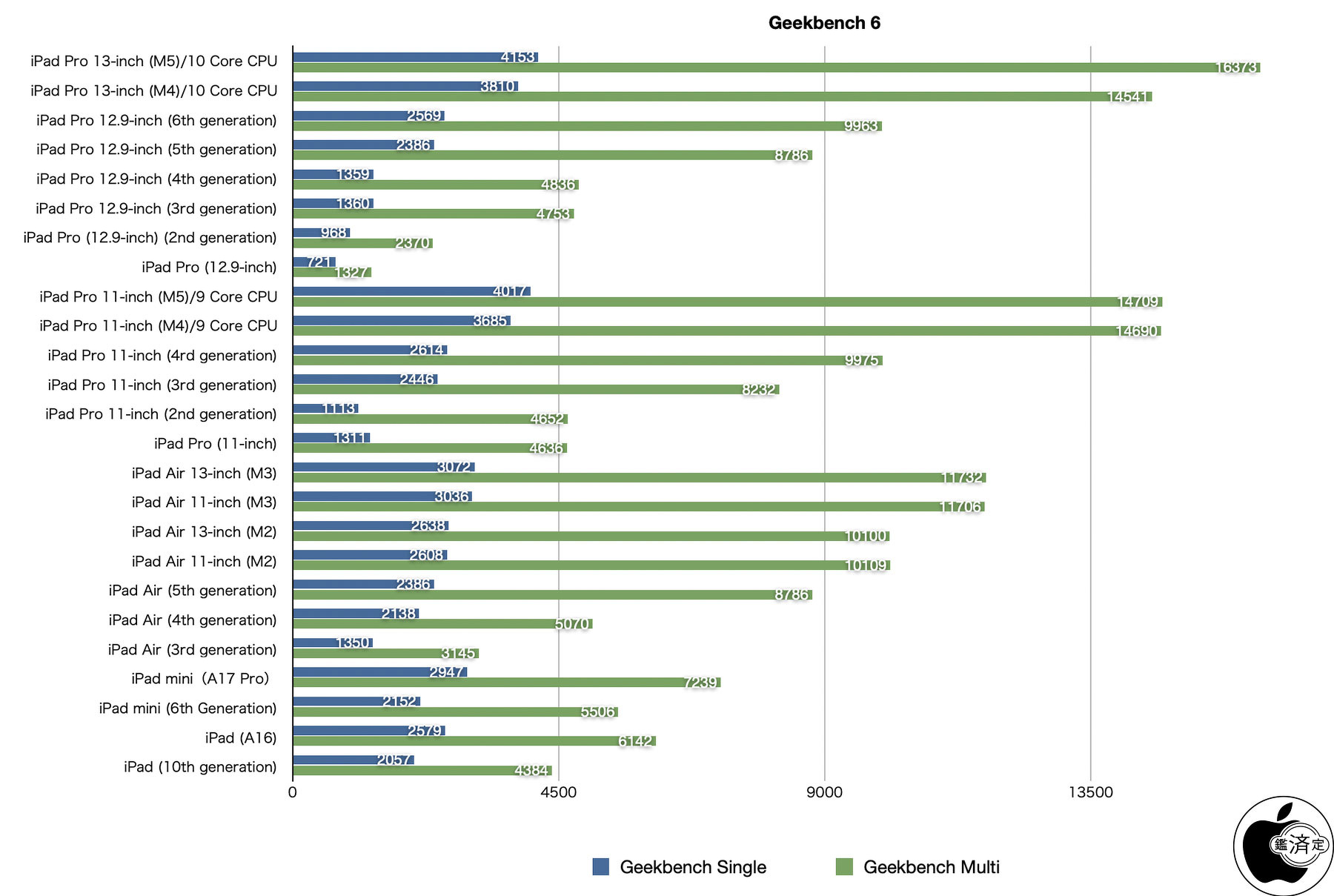 比較データーとして、iPadシリーズのGeekbench 6計測データを使用しています。