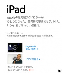 これまでは「3Gモデルは4月*発売」と注釈付きで(日本における通信会社および販売については後日発表されます。)と記載されていましたが、現在は「3Gモデルは4月発売」と注釈が無くなっています。