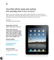2010年04月01日(木) iPad#AppleStore#iPad#US_Apple US Apple、iPadのApple Retail Store受取予約者に案内メールを送信 ※本サイトは、アフィリエイト広告および広告による収益を得て運営しています。購入により売上の一部が本サイトに還元されることがあります。 US Appleが、iPadの購入予約希望登録者で、Apple Retail Store受取予約を行ったユーザーに対して案内メールを送信しています。 4月3日の午前9時〜午後3時までに来店すれば、予約者の購入が認められ、それ以降は、在庫があれば先着順で受取可能だと説明されています。