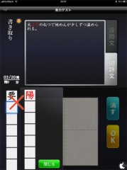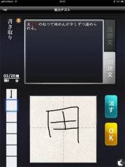 問題文が表示されたら、赤く表示された部分に当てはまる漢字を、画面下のマス上に手描きします。