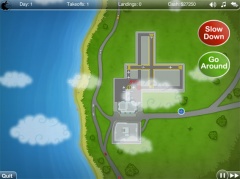 他の空港管制ゲームのように、指で軌跡を描いて誘導するタイプとは異なり、飛行機の操縦は自動運転で、滑走路近くになったら、直接飛行機をタップして、スローダウンボタンをタップして、速度を落とすと、着陸してくれます。