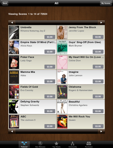 内蔵されている Scorch Store にて楽譜を探して閲覧することができ、ダウンロードしたい楽譜は iTunes アカウントを利用して購入できます。