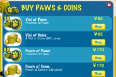 コインを貯めてペットショップを経営し続ける事も出来ますが、アプリ内課金でPawsを購入すると拡張アイテムや速度がアップします。