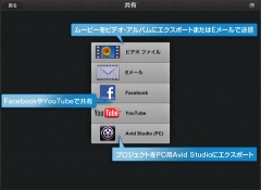 YouTube、Facebook、Eメールなどでムービーを簡単に共有でき、PC用Avid Studioにプロジェクトをエクスポートすることが出来ます。