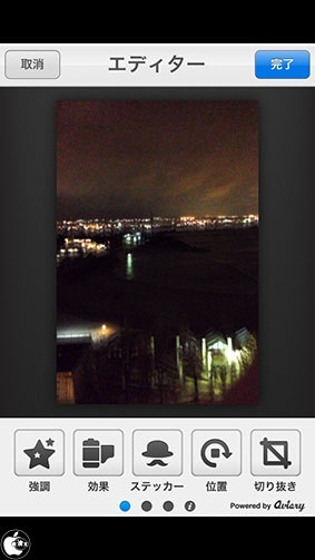 撮影した写真は、搭載されているAviaryのフォトエディタの画像編集機能を使って編集することが出来ます。