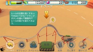 指でなぞってレールを繋げたり、速度やスリル度をアップするために、レールをつまみ上げたり、ループを追加したりしてジェットコースターを走らせてテストを繰り返します。