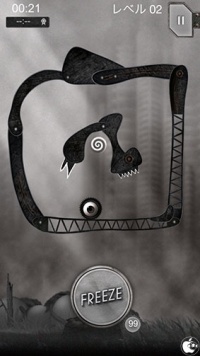 シーンによって、FREEZEボタンをタップして、目玉への重力を遮断して固定し、その状態で檻を動かして、あるタイミングでFREEZEボタンを解除することでクリア出来るといった場面も登場します。