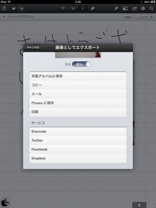またノートを画像として保存する場合、Twitter、Facebookに投稿したり、Evernote、Dropboxに保存することが出来ます。