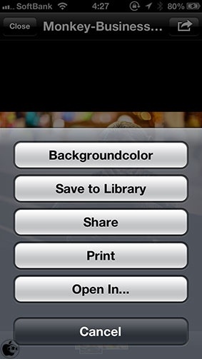 アクションボタンをタップして、背景色変更、写真ライブラリー保存、メール添付(Share)、印刷、別アプリ転送などが行えます。