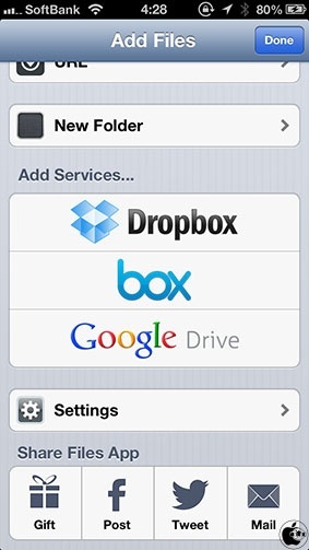 Add Servicesとして、Dropbox、box、Google Driveといったクラウドサービスにも対応しています。
