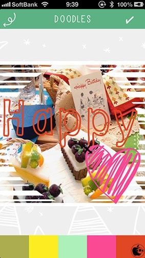 ボーダー(フレーム)、テキスト、手書きデコレーションパーツなどは、配置した後に拡大/縮小したり、画面下のカラーをタップするだけで色を変えることが出来ます。