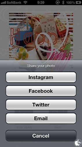 作成した写真は、FacebookやTwitterに投稿したり、Instagramに転送したりすることが出来るようになっています。