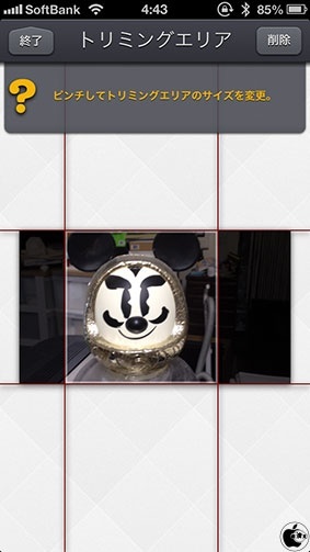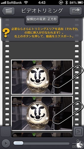 このアプリのポイントは、全動画フレームに対して切り抜き範囲設定されている状態で、任意のフレームをタップすると、その切り抜きエリアの位置や大きさを変更することが出来るという点です。