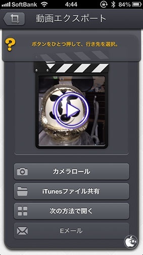 完成した動画は、カメラロール保存やiTunesファイル共有(アプリ内保存)の他に、他のアプリに転送することなどが出来るようになっています。
