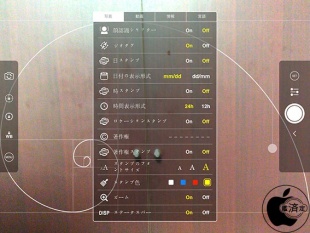 SETボタンをタップすると、顔認識シャッター、GEOタグ、日付スタンプ、時間表時形式、ロケーションスタンプ、著作権スタンプ、ズーム、ステータスバーのオン/オフを行う事が出来るようになっています。