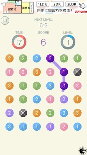 同じ色の数字を、3つ以上連続でつなげると、数字に対して10倍ポイントが加算されます。