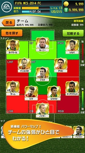 自分のチームの戦力をフォーメーション上に視覚的に表現したパワーマップが新機能として搭載し、対戦チームとの比較で、自分のチームの強弱ポイントがひと目で分かるため、効率的に選手やチームを育てることができます。