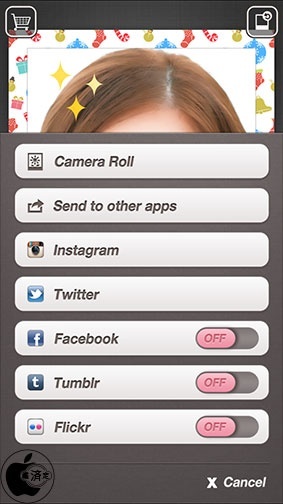 また、Instagram、Twitter、Facebook、Tumblr、Flickrに投稿することも可能となっています。
