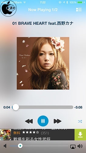 再生中の楽曲は、ダウンロードアイコンをタップすると、アプリ内にダウンロードすることが可能で、音楽タブに保存されます。