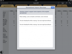 転送されたファイルをタップすると、Numbers for iPadでは利用出来ないヘッダ/フッダの設定や、iPhone OSに含まれていないフォントなどを置き換えたり、削除したりするが良いか?というダイアログが表示されます。