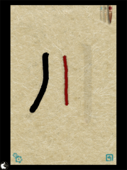 和紙風の上に薄く漢字が表示され、書き順に沿って赤い線が表示されるので、その線と同じ動きで画面を指でなぞります。