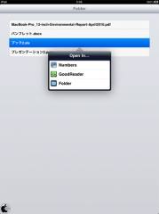 任意のファイルをタップすると、関連するアプリケーションが表示され、コピー転送したり、開いて見ることが出来るようになっています。