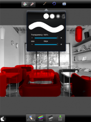 画面上の筆ボタンをタップすると、ブラシパターンや透明度、ブラシの太さなどを変える事が出来るようになっています。