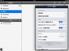 右上のユーザー設定をタップすると、タイムラインの取得設定、非公式RTのオン/オフ、アピアランス設定などを行うことが出来ます。