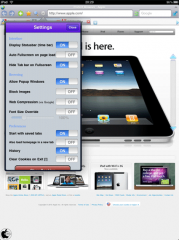 設定には、ステータスバー表示、自動フルスクリーン、ポップアップウィンドウ表示、Web Compression、履歴、クッキーなど細かな設定を行えるのが特徴です。