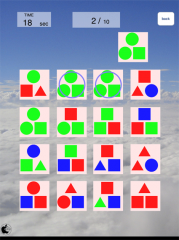 中央の16枚のパネルから、右上に表示される図形と同じものを3つ選びます。