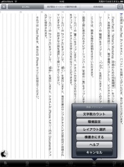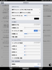 情報ボタンの環境設定をタップすると、文字スタイル、行書式、ページレイアウト、背景/選択範囲、行番号、制御コード、けい線、原稿用紙、アピアランス、禁則処理の文字設定など、かなり細かく設定が出来るようになっています。
