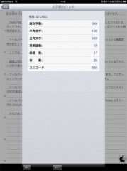 情報ボタンの文字数カウントボタンをタップすると、総文字数、半角文字数、全角文字数などの文字数を確認することが出来ます。